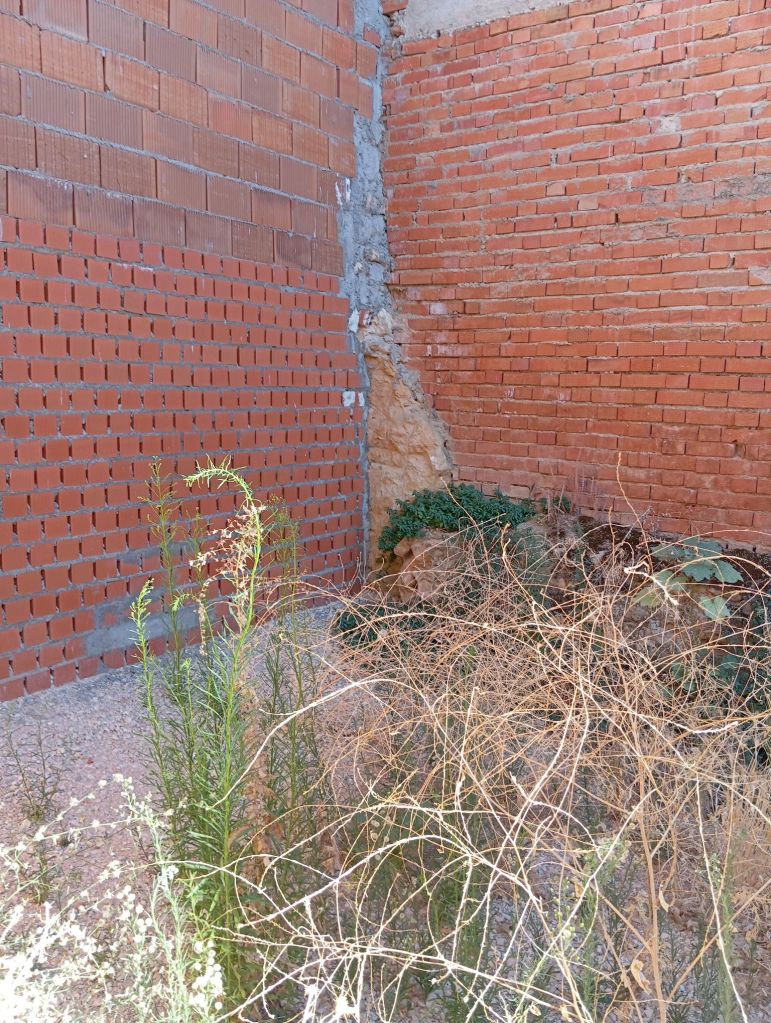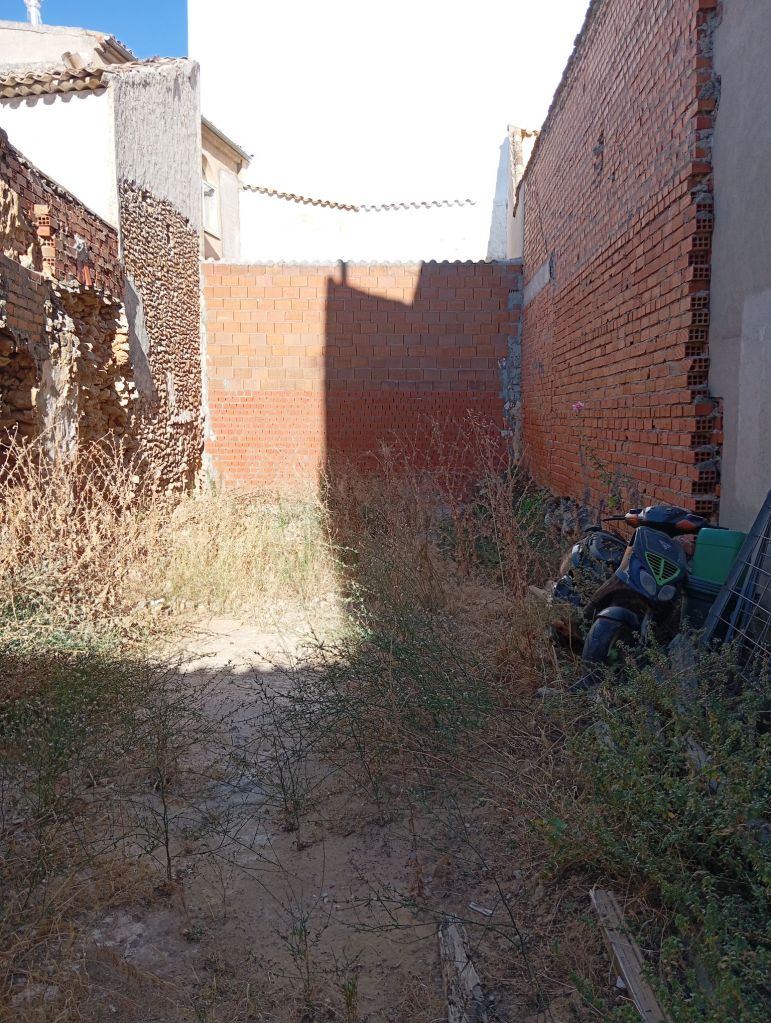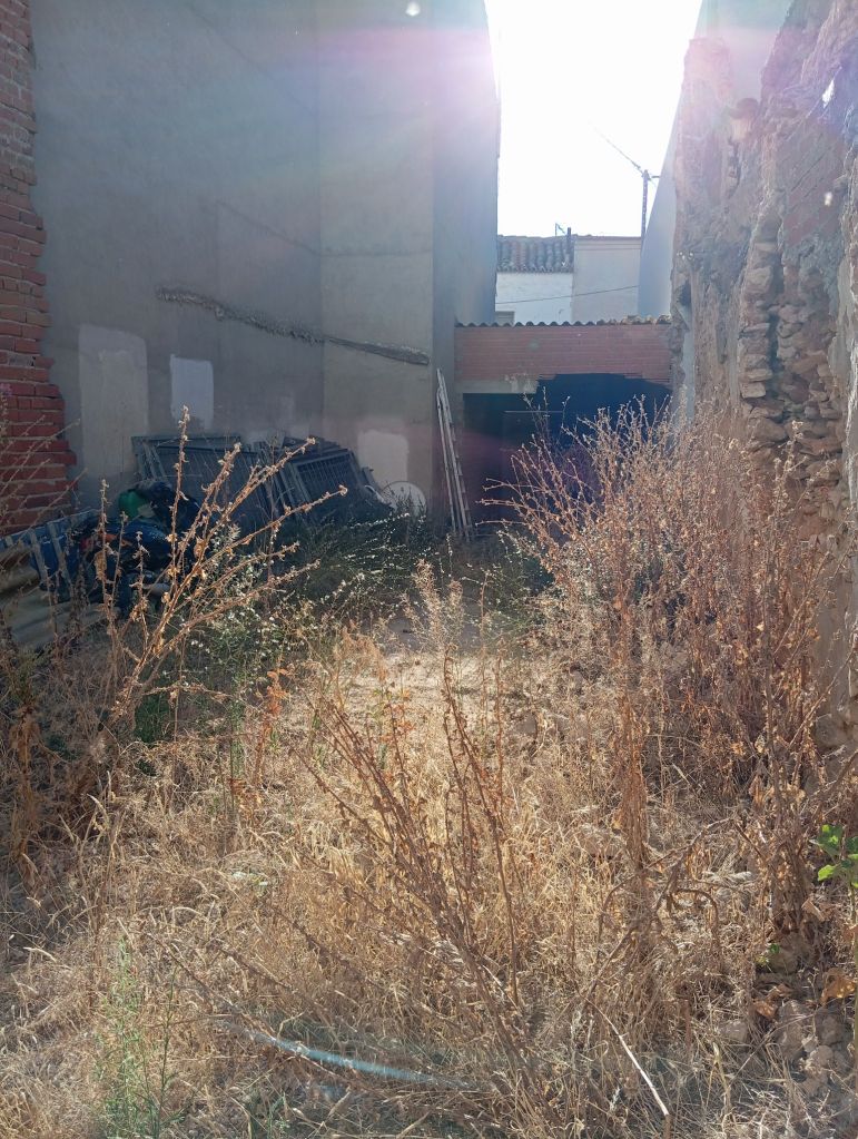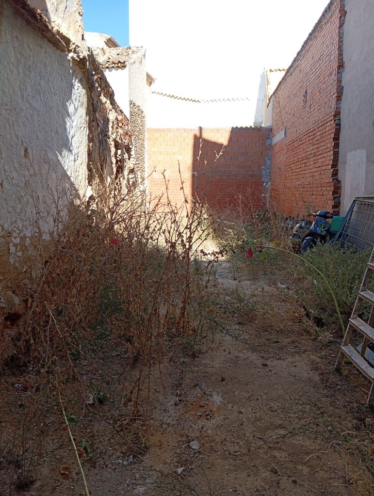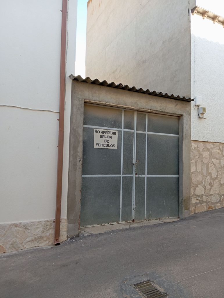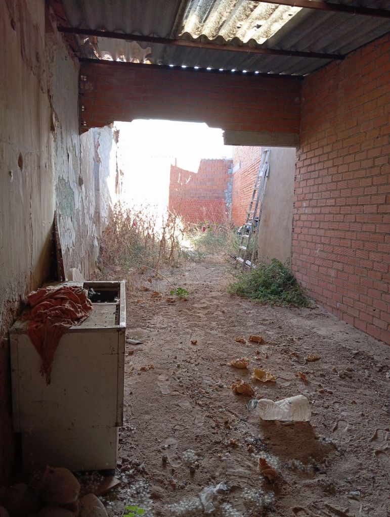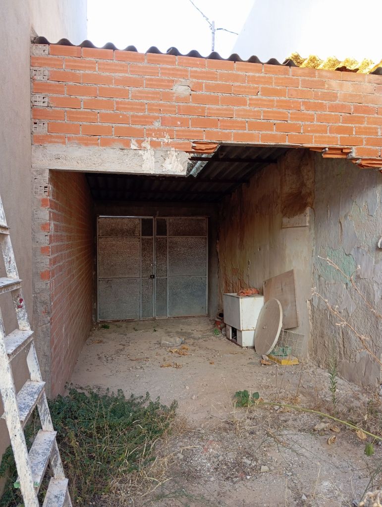 TERRENO CON CERRAMIENTO, RODEADO DE MUROS DE LADRILLO Y UNAS ANCHAS PUERTAS CON UNA ZONA CUBIERTA, COMO GARAJE